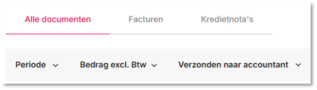 Vous pouvez filtrer les documents par période, par montant hors TVA et par envoi ou non à votre comptable. Cliquez sur la flèche et sélectionnez l'option souhaitée. La liste s'adapte immédiatement. Si un filtre est actif, il est indiqué en rouge.