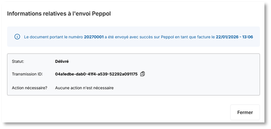 Vous y trouverez si la facture a effectivement été livrée ou non. L’ID de transmission constitue la preuve de la livraison et peut éventuellement être communiquée à la contrepartie si cela s’avère utile.