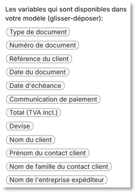 Dans les deux champs de texte, plusieurs variables peuvent être utilisées pour décrire votre entreprise, votre client et le document que vous envoyez via l’e‑mail concerné.