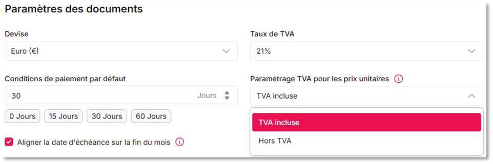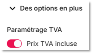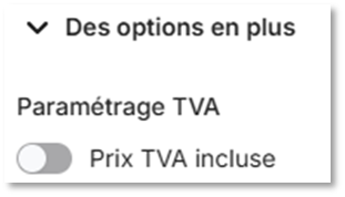 Si vous créez un nouveau document, vous verrez dans la colonne à droite, sous “Des options en plus” que le bouton coulissant "Paramétrage TVA" se trouve sur "Prix TVA incluse".