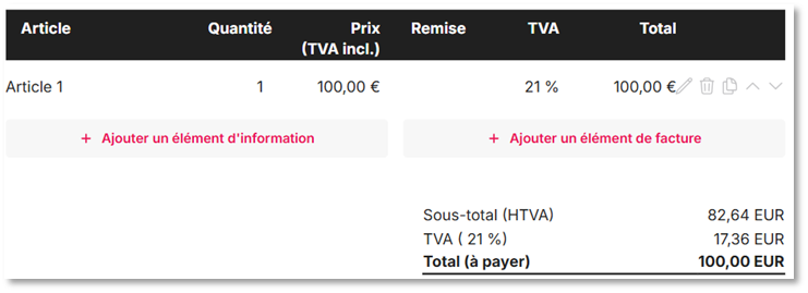 Lorsque vous créez une facture avec des prix TVA incluse, cela est également indiqué explicitement dans la colonne "Prix" du tableau de facturation.
