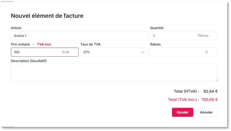 Lors de la saisie d'une nouvelle ligne de facture, "TVA incl." apparaît dans le champ "Prix unitaire" pour indiquer clairement que le montant que vous saisissez est TVA incluse. Kyte calcule automatiquement le montant total hors TVA et TVA incluse. Les deux montants sont affichés en bas.