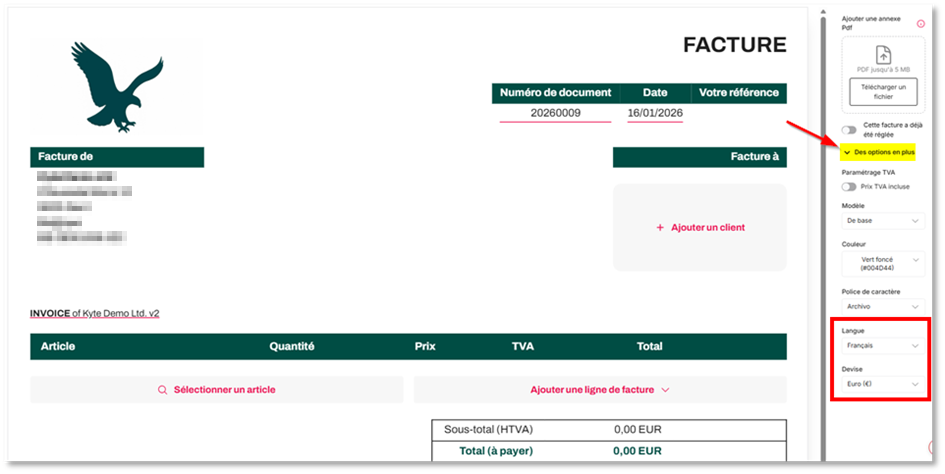 Bon à savoir : les instructions/boutons (+ Ajouter un client, Sélectionner un article, Ajouter une ligne de facture, etc.) restent toujours dans votre langue.
