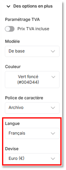 Lors de la création d'une facture ou d'une note de crédit, il est assez simple de modifier la langue ou la devise.