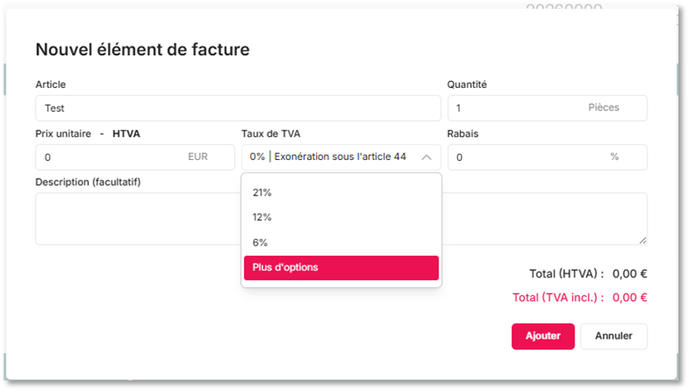 Vous n'avez pas besoin de saisir vous-même le texte supplémentaire correspondant au taux de TVA de 0 %. Vous le trouverez lors de la création d'un document, lorsque vous créez une nouvelle ligne de facture.
