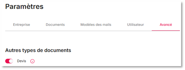 Pour pouvoir créer des devis, vous devez activer cette fonctionnalité. Cela se fait via les paramètres.