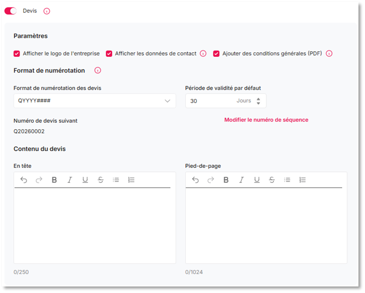 - Comme pour les factures, vous pouvez définir différents paramètres qui s’appliqueront à l’ensemble de vos devis.