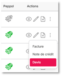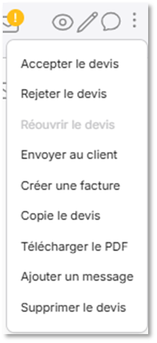 - Dans la liste des devis, en cliquant sur les trois points à la fin d’une ligne de devis