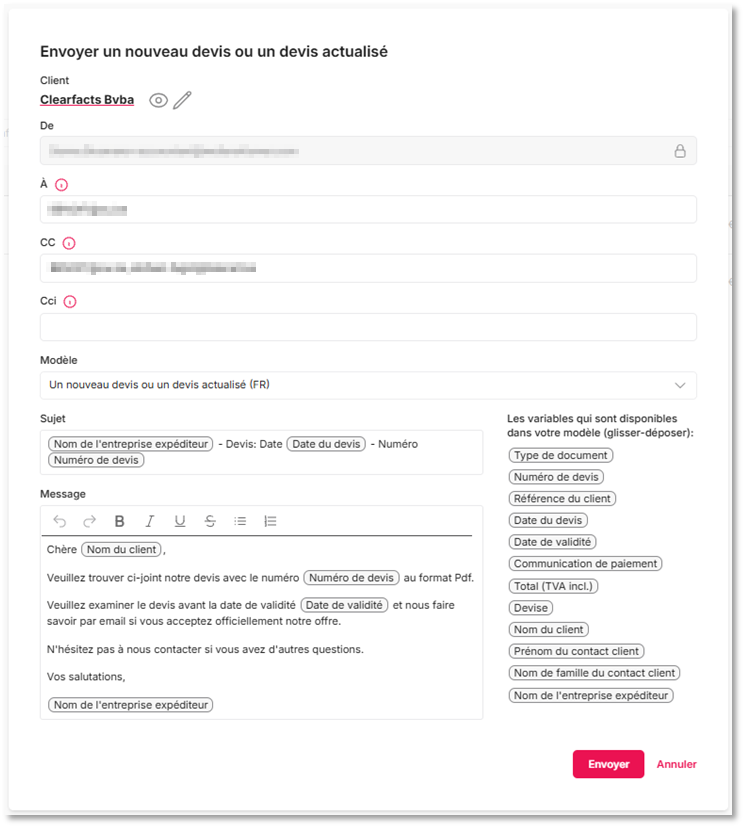 - La manière dont vous communiquez cette information à votre client est propre à votre organisation. Il est donc recommandé de personnaliser le modèle d’e‑mail générique en fonction de votre situation et de votre style de communication. Faites‑le de préférence avant l’envoi de votre premier devis.