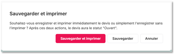 Vous pouvez aussi simplement le sauvegarder, sans l’imprimer ni le transmettre physiquement à votre client. Selon votre choix, cliquez sur "Sauvegarder et imprimer" ou sur "Sauvegarder" dans la fenêtre pop‑up.