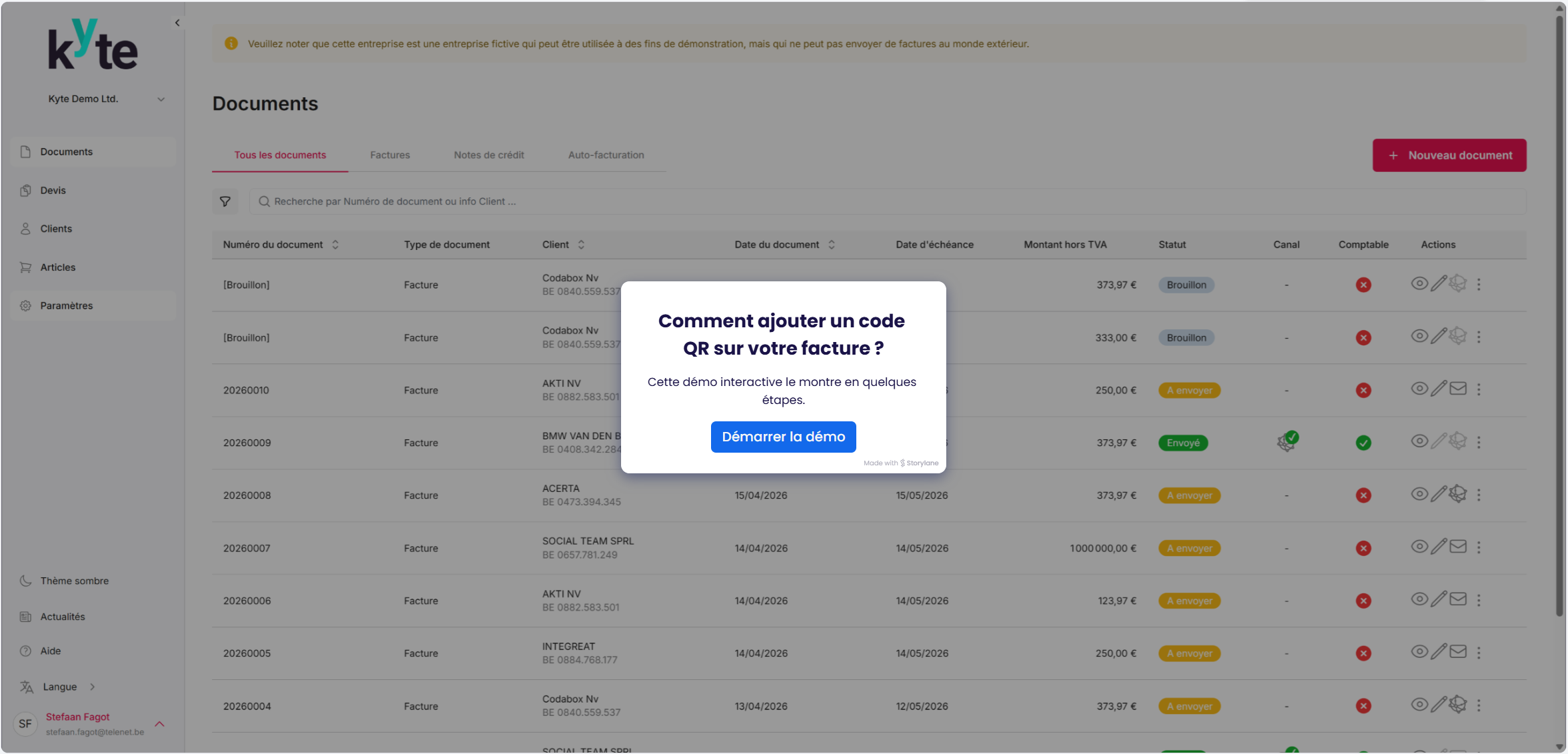 Cliquez sur cette démo pour voir comment ajouter un code QR à votre facture : Comment ajouter un code QR à votre facture