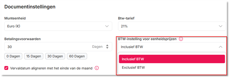 Als je nu een nieuw document opmaakt, zie je in de rechterkolom, onder “Extra opties” dat de schuifschakelaar “BTW-instelling” standaard ingesteld staat op “Prijzen BTW inclusief”.