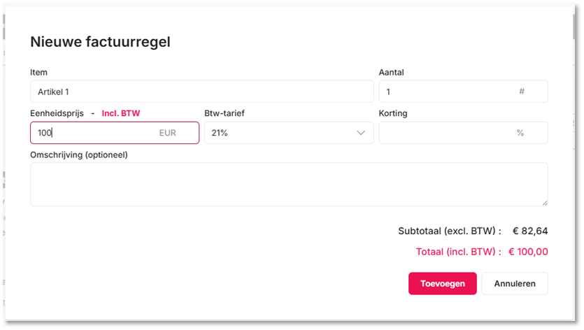 Bij het invoeren van een nieuwe factuurregel, verschijnt er “Incl. BTW” bij het veld “Eenheidsprijs” om duidelijk aan te geven dat het bedrag dat je daar ingeeft inclusief btw is. Het totaalbedrag exclusief en inclusief btw rekent Kyte zelf uit. Beide bedragen worden onderaan weergegeven.