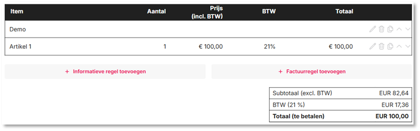 Wanneer je een factuur opstelt met prijzen inclusief btw, wordt dit ook expliciet aangegeven in de kolom “Prijs” van de factuurtabel.