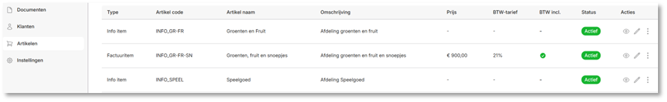 Naast producten en diensten met prijszetting kan je ook info-items aanmaken.
