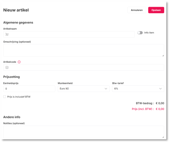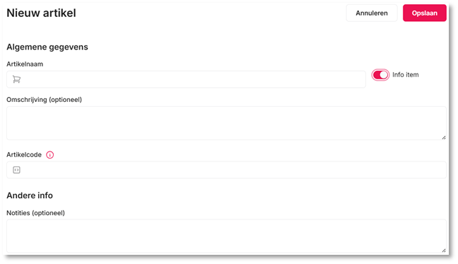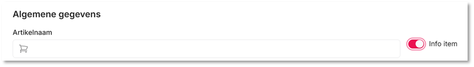 Info item: als je geen volwaardig artikel wil aanmaken, maar eerder vaak gebruikte informatie of een vaste titel die je regelmatig op je factuur zet, zet de schuifschakelaar dan op “Info item”. In dat geval moet je geen prijsinformatie invullen.