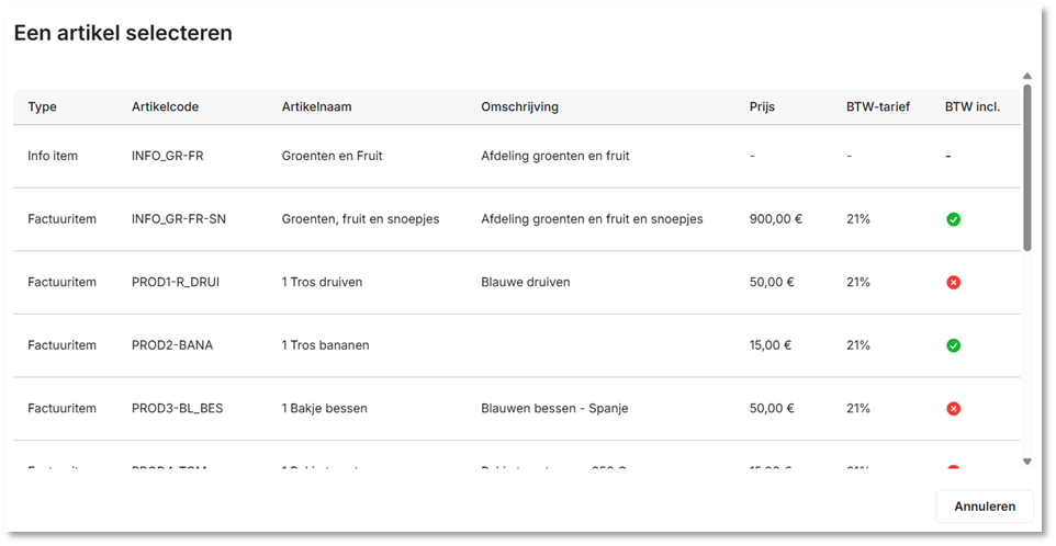 Bij de opmaak van een factuur kan je de aangemaakte artikelen opvragen en selecteren.