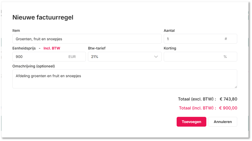 Als je daarmee klaar bent, klik op “Toevoegen” om de informatie op je factuur te zetten.