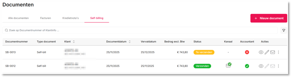 In de documentenlijst verschijnt een extra tabblad “Self-billing”. Daar staan de self-billing facturen die je aangemaakt en uitgestuurd hebt vanuit Kyte. De self-bills worden ook opgenomen in de tab “Alle documenten”.