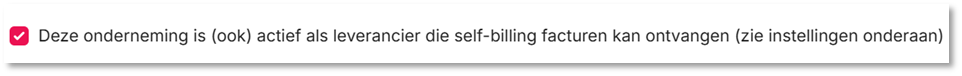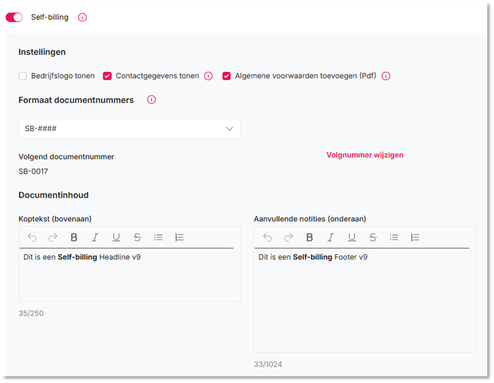 - Koptekst & Aanvullende notities: je kan een specifieke header- of footer-tekst instellen voor je self-billing facturen.