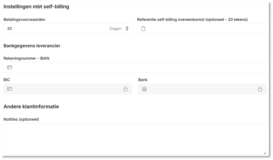 Er verschijnen extra instellingen, specifiek voor self-billing. Deze gegevens zijn optioneel. Als de bankgegevens en de referentie van de self-billing overeenkomst ingevuld worden, zullen ze worden vermeld op de self-billing facturen die je verstuurt naar deze leverancier.