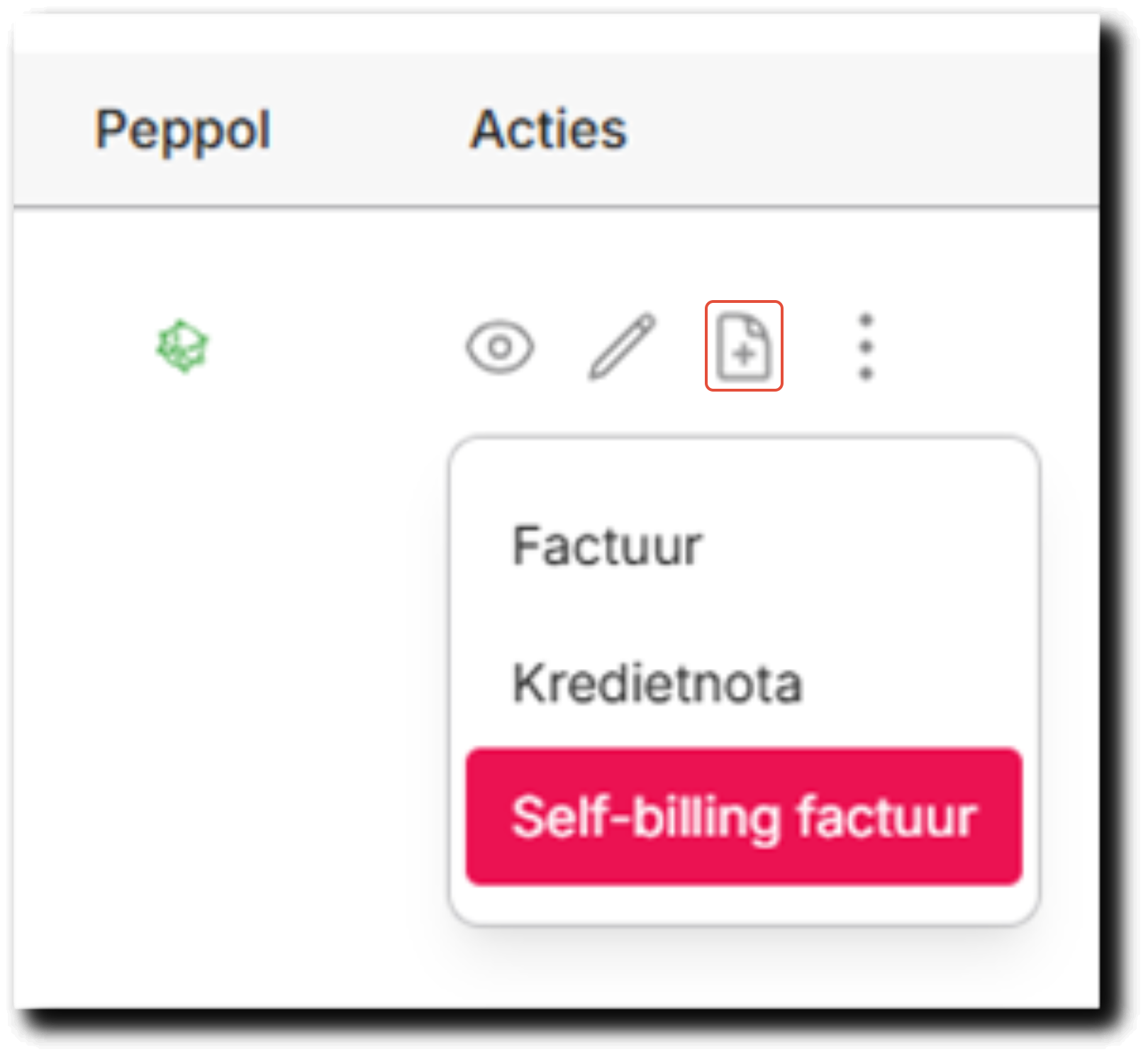 a) Vanuit de klantenlijst: kies of selecteer een klant en klik rechts op het actie-icoontje met de + . Selecteer vervolgens “Self-billing factuur”. Opgelet, dit lukt alleen als de betreffende klant ook als leverancier aangeduid werd (zie hierboven).